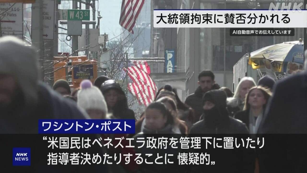 Newsmax TV 米保守メディア(英語限定の常時LIVE放送) あさ8(日本保守党)3分クッキング 百田尚樹・有本香のニュース生放送「ニュースあさ8時!」(略称あさ8)のAI要約 米世論調査 ベネズエラ 大統領拘束 賛否分かれる 米管理は反対 NHK(国際ニュース) 2026.01.06 米世論調査 ベネズエラ 大統領拘束 賛否分かれる 米管理は反対 | NHKニュース【NHK】アメリカの有力紙ワシントン・ポストは、ベネズエラ情勢について、最新の世論調査の結果を伝えました。アメリカが軍事作戦でマドゥーロ大統領を拘束したことについては、賛否が分かれる一方、ベネズエラを管理下に起