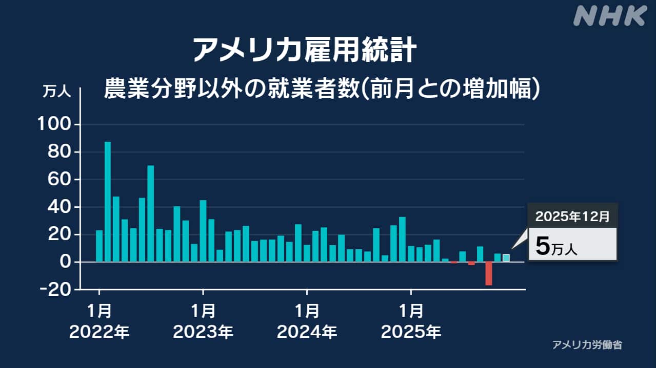 Newsmax TV 米保守メディア(英語限定の常時LIVE放送) REAL AMERICA'S VOICE 米保守メディア(英語限定の常時LIVE放送) あさ8(日本保守党)3分クッキング 百田尚樹・有本香のニュース生放送「ニュースあさ8時!」(略称あさ8)のAI要約 米 12月雇用統計 就業者は前月比5万人増も市場予想下回る NHK(国際ニュース) 2026.01.09 米 12月雇用統計 就業者は前月比5万人増も市場予想下回る | NHKニュース【NHK】円相場や株価に影響を及ぼすアメリカの雇用統計が発表され、先月の農業分野以外の就業者は前の月から5万人増加しましたが、市場予想を下回りました。一方、失業率は前の月と比べて0.1ポイント改善し、4.4%で