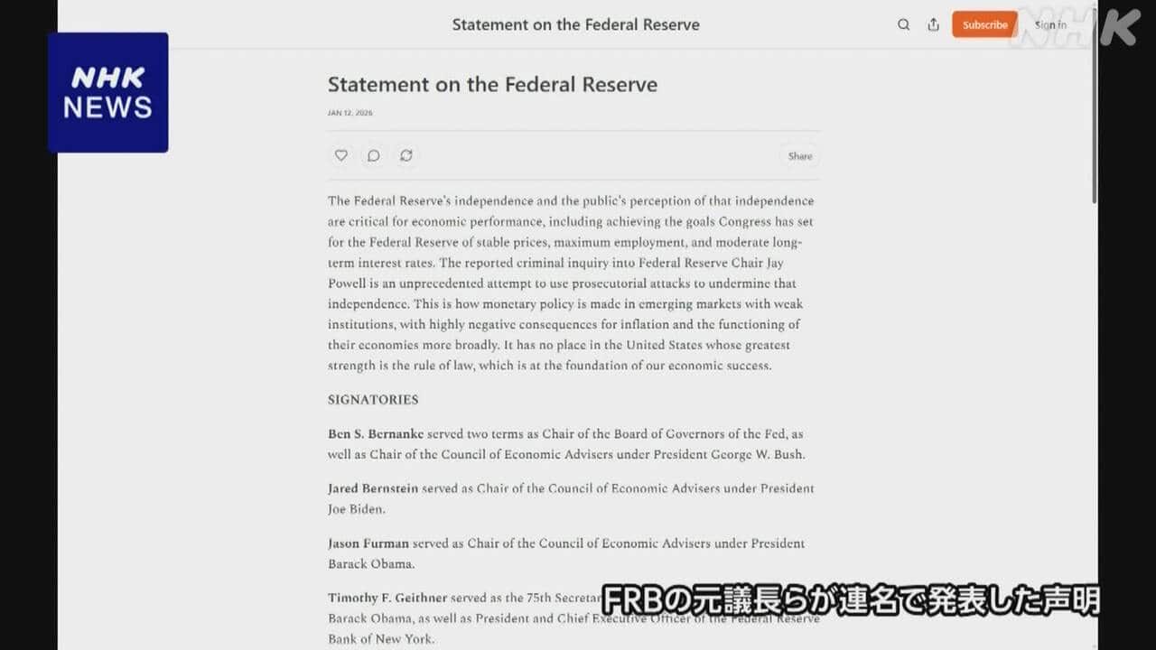 Newsmax TV 米保守メディア(英語限定の常時LIVE放送) あさ8(日本保守党)3分クッキング 百田尚樹・有本香のニュース生放送「ニュースあさ8時!」(略称あさ8)のAI要約 FRB議長の刑事告発示唆する文書 歴代議長らが司法省の対応非難 NHK(国際ニュース) 2026.01.13 FRB議長の刑事告発示唆する文書 歴代議長らが司法省の対応非難 | NHKニュース【NHK】アメリカのFRB=連邦準備制度理事会のパウエル議長が司法省から刑事告発を示唆する文書を受け取ったことを受け、FRBの歴代議長らが共同で声明を公表し、「独立性を損なおうとする前例のない試みだ」と厳しく非