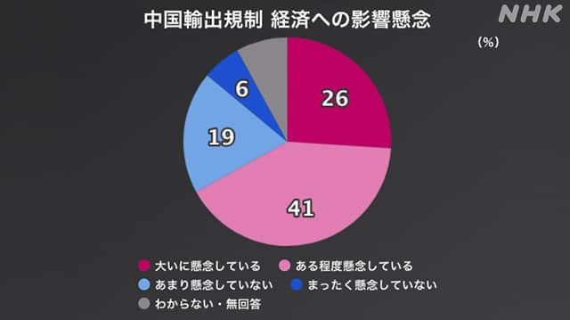 Newsmax TV 米保守メディア(英語限定の常時LIVE放送) あさ8(日本保守党)3分クッキング 百田尚樹・有本香のニュース生放送「ニュースあさ8時!」(略称あさ8)のAI要約 中国の輸出規制強化 “日本経済への影響懸念”約7割 世論調査 NHK(国際ニュース) 2026.01.14 中国の輸出規制強化 “日本経済への影響懸念”約7割 世論調査 | NHKニュース【NHK】中国が発表した日本への輸出規制強化について、NHKの世論調査で、7割近くの人が日本経済への影響を懸念していると答えました。NHKは1月12日までの3日間、全国の18歳以上を対象にコンピューターで