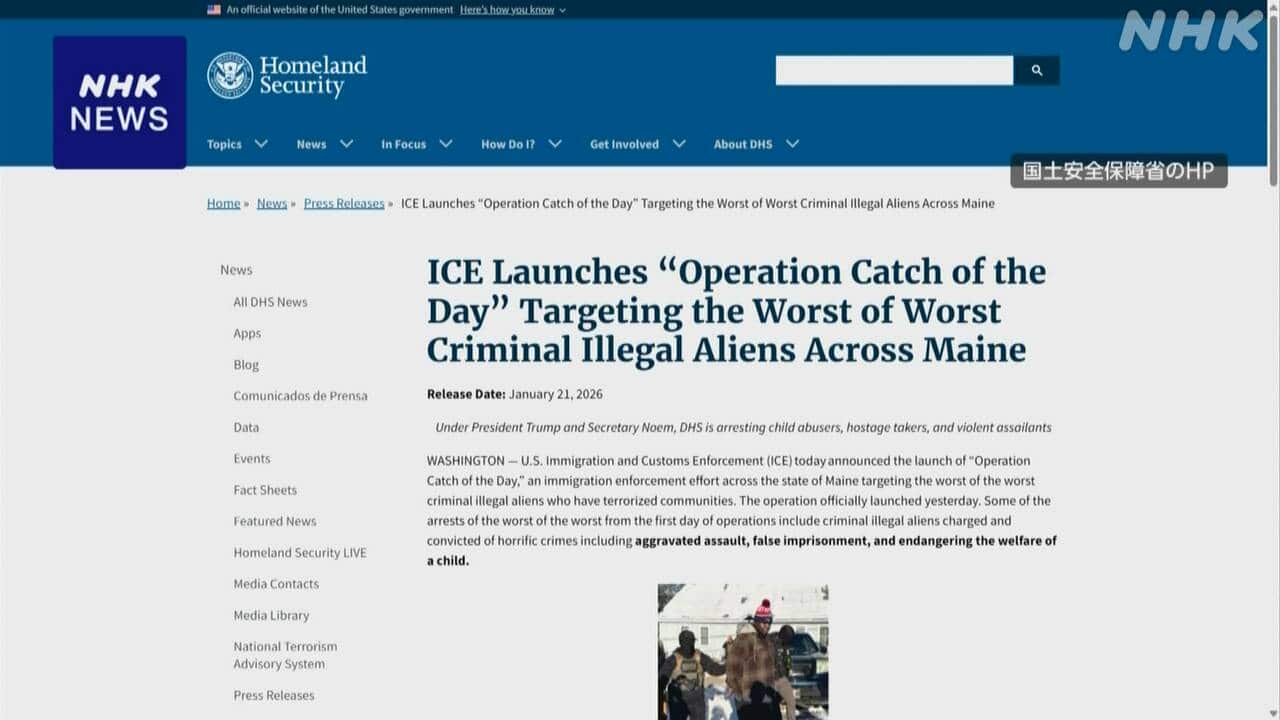 Newsmax TV 米保守メディア(英語限定の常時LIVE放送) あさ8(日本保守党)3分クッキング 百田尚樹・有本香のニュース生放送「ニュースあさ8時!」(略称あさ8)のAI要約 トランプ政権「きょうの漁獲作戦」メーン州で不法滞在者取締り NHK(国際ニュース) 2026.01.22 トランプ政権「きょうの漁獲作戦」メーン州で不法滞在者取締り | NHKニュース【NHK】アメリカのトランプ政権は、新たに東部メーン州で不法滞在者の取締りを始めたと発表しました。この取締りは「きょうの漁獲作戦」と名付けられ、メーン州で盛んな水産業にちなんだものとみられますが、批判の声も上が