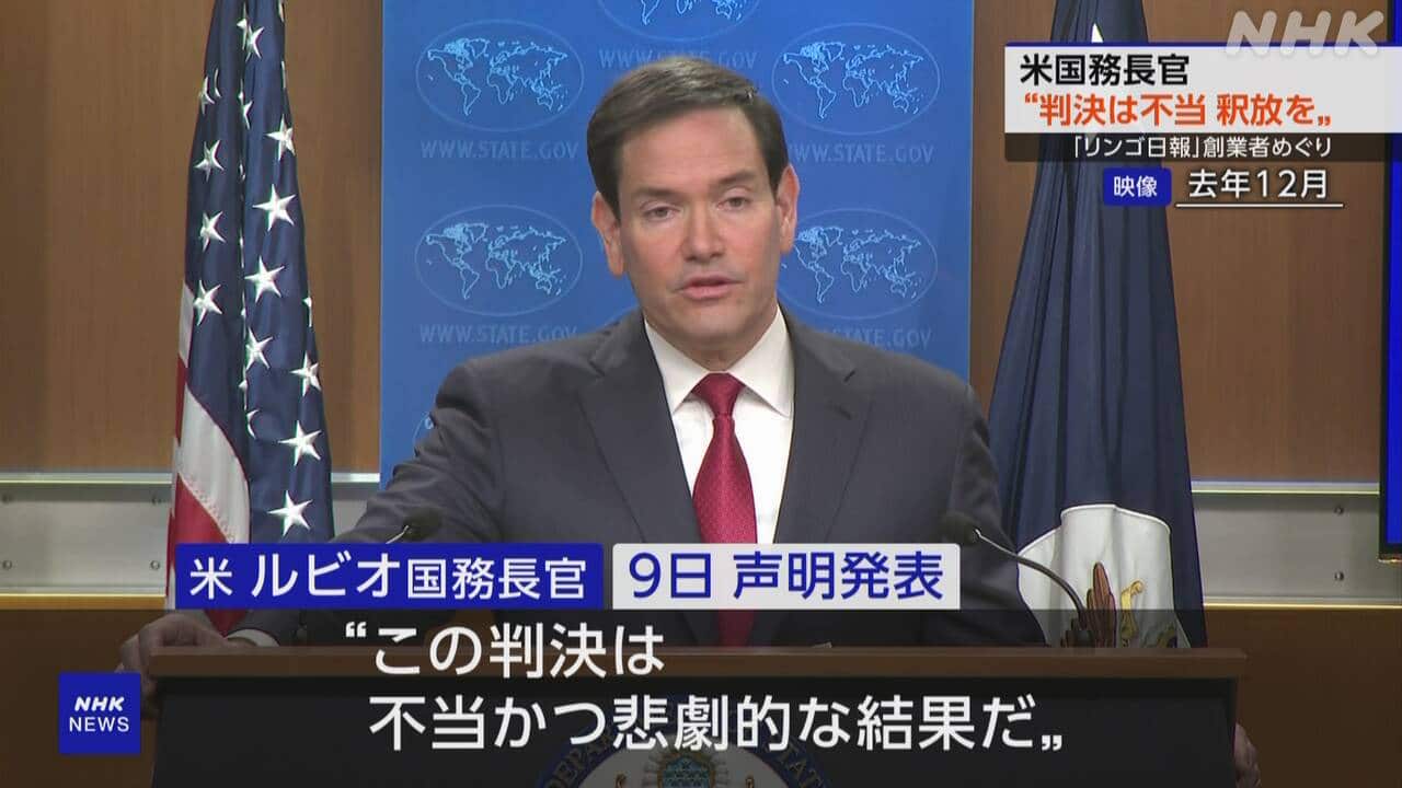Newsmax TV 米保守メディア(英語限定の常時LIVE放送) あさ8(日本保守党)3分クッキング 百田尚樹・有本香のニュース生放送「ニュースあさ8時!」(略称あさ8)のAI要約 米国務長官 香港「リンゴ日報」創業者の判決を非難 釈放求める NHK(国際ニュース) 2026.02.10 米国務長官 香港「リンゴ日報」創業者の判決を非難 釈放求める | NHKニュース【NHK】中国政府に批判的な論調で知られた香港の新聞の創業者に対し、現地の裁判所が懲役20年の判決を言い渡したことについて、アメリカのルビオ国務長官は「不当かつ悲劇的な結果だ」と非難し釈放を求めました。中
