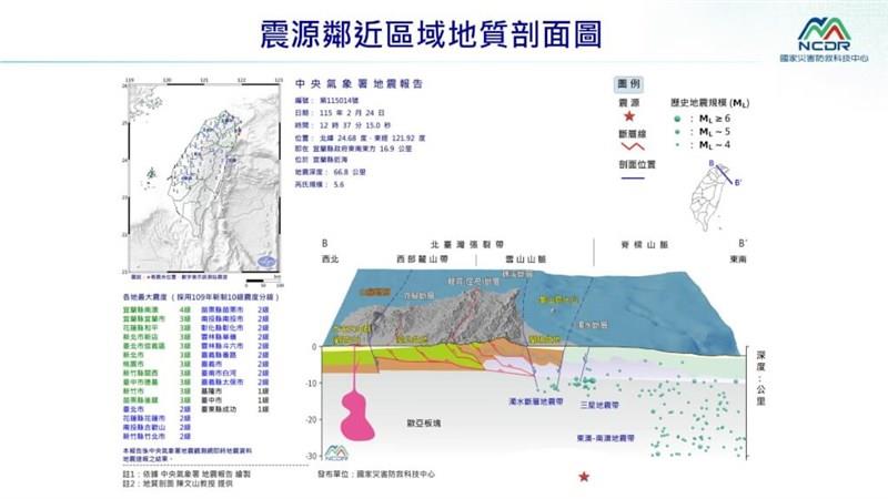(台北中央社)中央気象署(気象庁)は24日、同日午後0時37分ごろに発生した北東部・宜蘭県近海を震源とするマグニチュード(M)5.6の地震について、昨年12月27日に東部海域で起きたM7.0の地震の