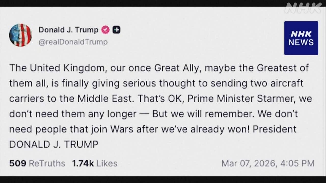 Newsmax TV 米保守メディア(英語限定の常時LIVE放送) REAL AMERICA'S VOICE 米保守メディア(英語限定の常時LIVE放送) あさ8(日本保守党)3分クッキング 百田尚樹・有本香のニュース生放送「ニュースあさ8時!」(略称あさ8)のAI要約 トランプ大統領 イギリスの中東への空母派遣検討“必要ない” NHK(国際ニュース) 2026.03.08 トランプ大統領 イギリスの中東への空母派遣検討“必要ない” | NHKニュース【NHK】アメリカのトランプ大統領は7日、イギリスが中東への空母の派遣を検討しているとする一方で、「もう必要ない」などとSNSに投稿しました。イランへの軍事作戦の当初、イギリス側が軍事基地の使用をアメリカ軍に認