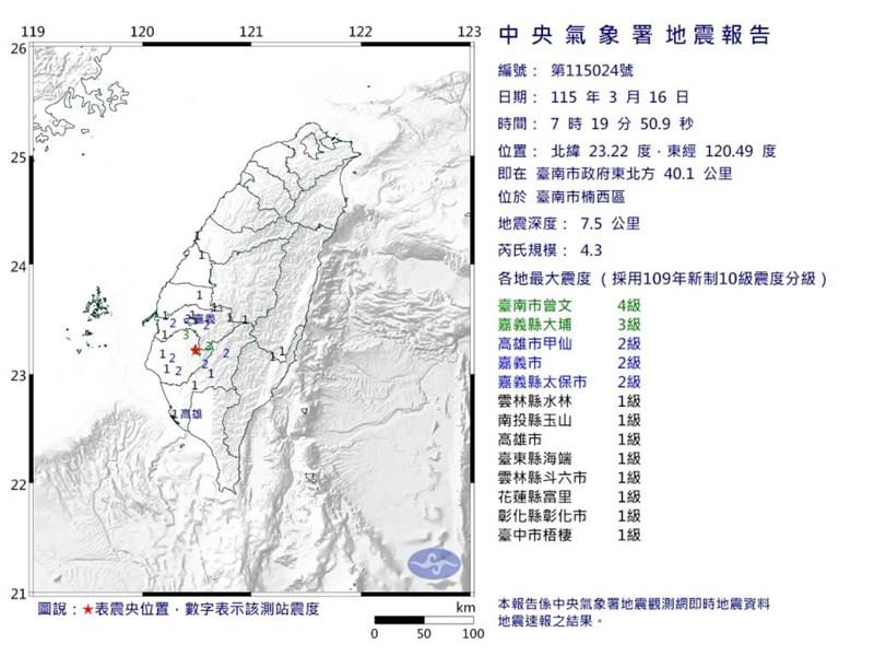 Newsmax TV 米保守メディア(英語限定の常時LIVE放送) REAL AMERICA'S VOICE 米保守メディア(英語限定の常時LIVE放送) あさ8(日本保守党)3分クッキング 百田尚樹・有本香のニュース生放送「ニュースあさ8時!」(略称あさ8)のAI要約 台南市楠西区でM4.3の地震 最大震度4を観測/台湾(中央社フォーカス台湾) フォーカス台湾 2026.03.16 台南市楠西区でM4.3の地震 最大震度4を観測/台湾(中央社フォーカス台湾) - Yahoo!ニュース(台北中央社)16日午前7時19分ごろ、南部・台南市楠西区を震源とする地震があった。中央気象署(気象庁)によれば、震源の深さは7.5キロ、地震の規模を示すマグニチュード(M)は4.3と推定される。