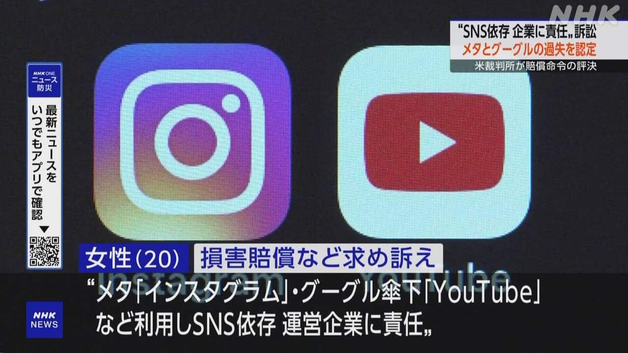Newsmax TV 米保守メディア(英語限定の常時LIVE放送) REAL AMERICA'S VOICE 米保守メディア(英語限定の常時LIVE放送) あさ8(日本保守党)3分クッキング 百田尚樹・有本香のニュース生放送「ニュースあさ8時!」(略称あさ8)のAI要約 未成年SNS依存訴訟 メタとグーグルに約9億5000万円賠償命じる NHK(国際ニュース) 2026.03.26 未成年SNS依存訴訟 メタとグーグルに約9億5000万円賠償命じる | NHKニュース【NHK】子どものころにSNS依存に陥ったとする女性が運営企業に責任があるとして、賠償を求めた裁判で、アメリカ西部カリフォルニア州の裁判所の陪審員は、サービスを運営するアメリカIT大手の「メタ」と「グーグル」に