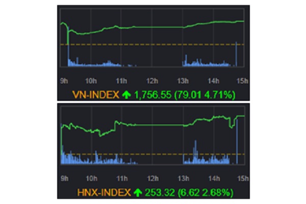 8日のベトナム株式市場は、VNインデックス、HNXインデックスともに急騰した。VNインデックスは前営業日比+79.01ポイント(+4.71%)高の1756.55ポ...