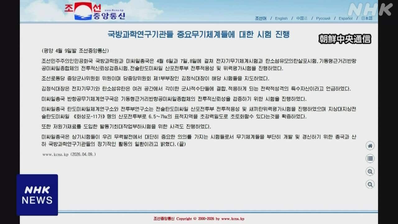 Newsmax TV 米保守メディア(英語限定の常時LIVE放送) REAL AMERICA'S VOICE 米保守メディア(英語限定の常時LIVE放送) あさ8(日本保守党)3分クッキング 百田尚樹・有本香のニュース生放送「ニュースあさ8時!」(略称あさ8)のAI要約 北朝鮮 “8日までの3日間 重要な兵器システムの実験実施”報道 NHK(国際ニュース) 2026.04.09 北朝鮮 “8日までの3日間 重要な兵器システムの実験実施”報道 | NHKニュース【NHK】北朝鮮のメディアは、8日までの3日間にわたり、重要な兵器システムの実験が行われたと伝えました。北朝鮮が相次いで短距離弾道ミサイルを発射したことを指すとみられます。北朝鮮国営の朝鮮中央通信は9日、